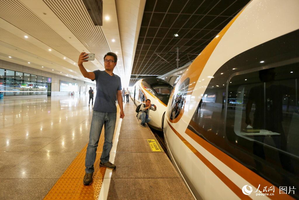 乘客與“復興號”合影留念。王初 攝 人民網上海9月21日電 ( 肖云峰、單芳、王初)9月21日零時起,全國鐵路實行新的列車運行圖,7對“復興號”動車組列車在京滬高鐵線率先實現350公里時速運營,京滬高鐵邁進達速新時代。 據悉,鐵路部門精心設計京滬高鐵達速方案,安排7對“復興號”動車組分別擔當G1/G2、G3/G4、G5/G6、G7/G8、G9/G10、G13/G14、G17/G18次,在京滬高鐵線按時速350公里運行,全程運行時間在4個半小時左右,進一步縮短京滬兩地間時空距離。 “復興號”動車組列車是按照時速350公里運營研發制造的中國標準動車組,集成了大量現代高新技術,其安全性、經濟性、舒適性以及節能環保等性能有較大提升。該列車率先在京滬高鐵實現350公里時速運營,為沿線各大中心城市之間人民群眾出行提供了更多的選擇,更好地滿足了廣大旅客對不同速度等級高鐵運輸的需求。 相關新聞:時速350公里!實拍“復興號”達速運行前的“體檢” -