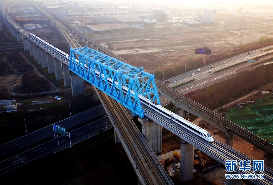 12月19日,一列高鐵從轉體成功后的商合杭高鐵跨鄭徐高鐵T構梁下駛過。商合杭高鐵線路全長794.55公里,設計時速350公里。今年開跑的“復興號”在京滬高鐵實現350公里時速運營,再次創造了領先世界的中國速度。目前,中國鐵路在勘察設計、工程建造、高速動車組、列車控制、牽引供電、運營管理、安全保障等領域已經取得一系列自主創新成果,中國鐵路總體技術水平已邁入世界先進行列,部分技術處于世界領先水平。作為中國“新四大發明”之一,高鐵不僅安全、便利、快捷地服務著中國旅客,同時也驚艷著世界。新華社發(李嘉南 攝) -