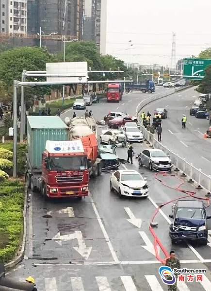 有媒體轉述網友報料,稱肇事車輛是油罐車。市民擔心該車會出現泄油,后果不堪設想。記者了解到其實一輛攪拌車,泄露部分潤滑油并不存在易燃的隱患。橋頭消防大隊伍隊長表示,在上午11時接到報警,立馬調動一輛裝備車、一輛水罐車,共派出7名消防員趕赴現場,F場非常混亂,車輛橫豎不一地擠在一塊。消防員對每一輛車進行仔細檢查,沒有發現有傷者被困。包括攪拌車在內,現場約有13輛車受此沖撞影響。