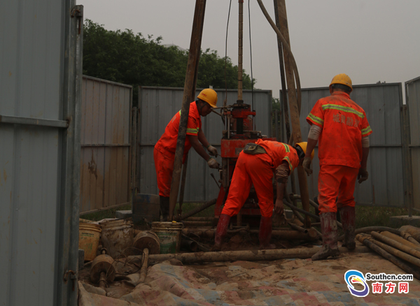 今天上午,地鐵1號線望洪站的勘探點上,一臺鉆機“突突”作響,從早上7點開始這臺鉆機就沒有停歇,向地下鉆進,并將地下的砂土、巖層一一帶上了地面。