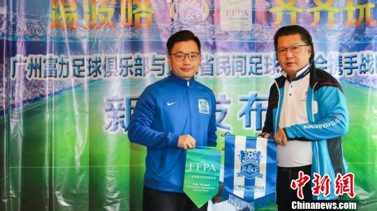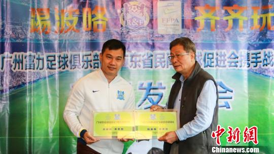 容志行(圖右)代表廣東民促會(huì)互贈(zèng)“廣東省民間足球促進(jìn)會(huì)與廣州富力足球俱樂(lè)部攜手戰(zhàn)略合作”牌匾。 岳超蓮 攝