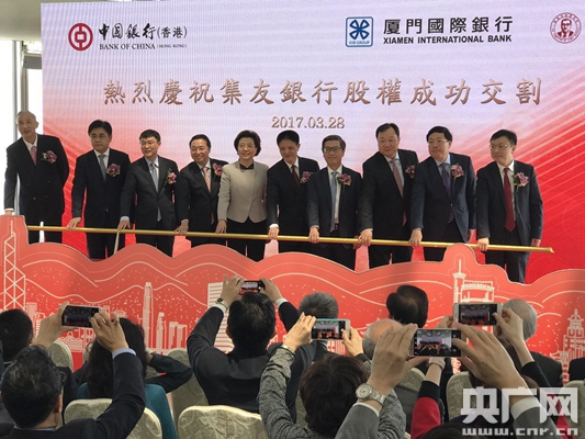 央廣網(wǎng)香港3月28日消息(記者周偉琪)廈門國際銀行股份有限公司(下稱“廈門國際銀行”)、福建省廈門市私立集美學(xué)校委員會(huì)(下稱“集美校委會(huì)”)與中國銀行(香港)有限公司(下稱“中銀香港”)在香港聯(lián)合舉行集友銀行股權(quán)成功交割儀式,慶祝集友銀行股權(quán)買賣所有工作全部順利完成。中央人民政府駐香港特別行政區(qū)聯(lián)絡(luò)辦公室副主任仇鴻,福建省委常委、常務(wù)副省長張志南,中國銀行行長陳四清,香港金融管理局副總裁阮國恒,中國銀行副行長任德奇,中銀香港副董事長兼總裁岳毅,廈門市委常委、廈門統(tǒng)戰(zhàn)部部長兼集美校委會(huì)主任張燦民、廈門國際銀行總裁呂耀明、集友銀行管理層代表及社會(huì)各界人士參加了儀式。香港福建社團(tuán)聯(lián)會(huì)吳良好主席等福建鄉(xiāng)賢、香港各界人士、集友銀行客戶及員工代表等亦蒞臨儀式現(xiàn)場(chǎng),共同見證集友銀行在發(fā)展史上揭開新的一章。