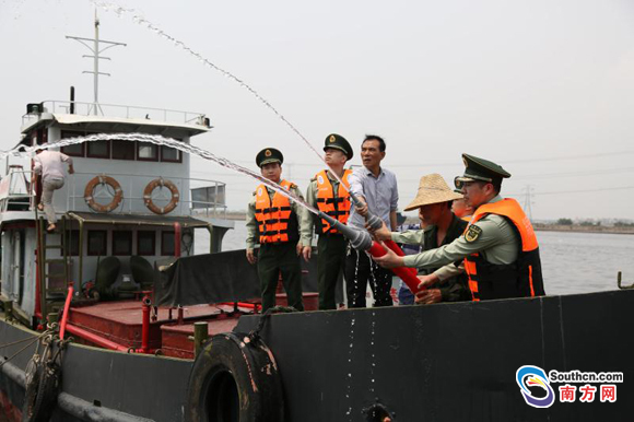 在“海門港消防壹號”船上,擁軍模范好人羊老五與官兵一同操作消防設施 劉建高/攝