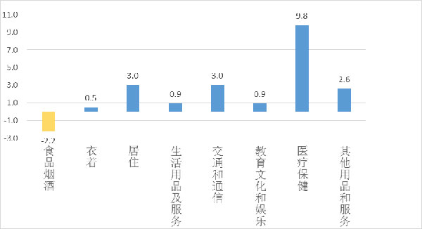 從不同類別看,八大類居民消費價格“七升一降”。其中,醫(yī)療保健類價格上漲9.8%,居住類價格、交通和通信類價格均上漲3.0%,其他用品和服務類價格上漲2.6%,生活用品及服務類價格、教育文化娛樂類價格均上漲0.9%,衣著類價格上漲0.5%;食品煙酒類價格下降2.2%。