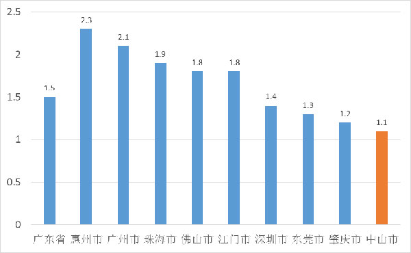 與周邊城市比較,2017年第一季度中山CPI上漲1.1%,比全省(上漲1.5%)低0.4個百分點,在珠三角九市中漲幅最低。