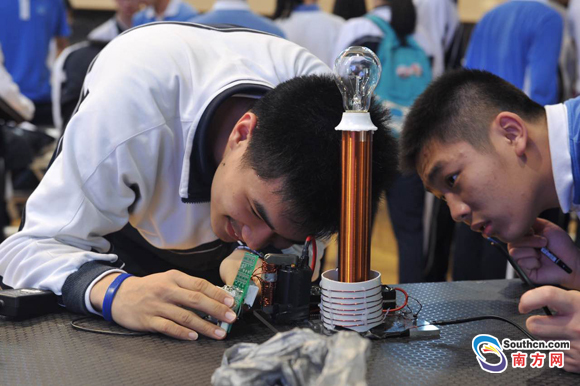 南方網(wǎng)訊 在自習(xí)課上如果說(shuō)話(huà)聲太大,一款高分貝提醒器將作出“警示”;教室內(nèi)的溫度如果過(guò)高或過(guò)低,智能化空調(diào)將匹配調(diào)節(jié)……這些“神器”都出自深圳實(shí)驗(yàn)學(xué)校高中部學(xué)生之手,這里的高中生們善于對(duì)生活進(jìn)行觀察和思考,喜歡做小發(fā)明、小創(chuàng)造,并用動(dòng)手實(shí)踐將創(chuàng)意轉(zhuǎn)化為實(shí)物。而這與學(xué)校重視科技創(chuàng)新以及開(kāi)發(fā)多層次、系統(tǒng)的科技創(chuàng)新課程、活動(dòng)密切相關(guān)。深圳實(shí)驗(yàn)學(xué)校高中部科技節(jié)日前落下帷幕,該校也首次對(duì)外系統(tǒng)介紹其科技創(chuàng)新實(shí)踐教育情況。
