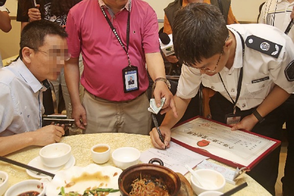 8日晚上7點準,督查人員就隨機抽查羅湖區鳳凰鳳山大廈附近餐飲服務場所控煙情況。這個點正是用餐的高峰期,對于執法人員的突然"殺到",餐館工作人員及用餐者都感到有些詫異有些緊張。執法人員以最快的速度,最尖銳的眼力巡查餐館的每一個角落。突擊檢查的前兩家餐館香港新發燒臘餐館(黃貝嶺店)和巴蜀風都未發現有人抽煙,整體情況良好。