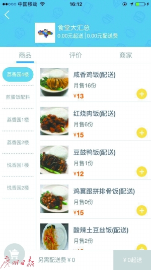 記者下載了該訂餐軟件,在該外賣平臺上,共有五個可供學生選擇的窗口,分別是悅香園二樓、荔香園二樓、荔香園四樓、荔香園一樓和悅香園一樓。每個窗口提供3~9種餐食,包括水餃、拉面、米飯粥等。除配送外,這些窗口還可以選擇打包自取。同樣的餐食如果自取,將會優惠1.5元。該平臺公告欄上顯示,食堂提供的送餐服務僅僅是中餐和晚餐飯點的配送。而且據了解,“校食易”上的一些菜式是窗口沒有的。