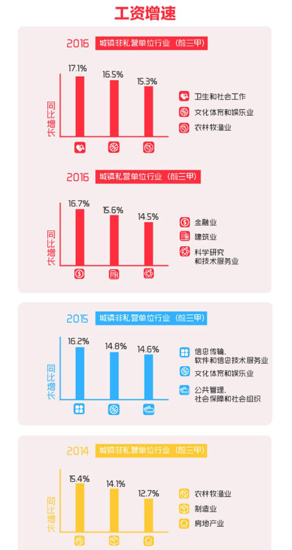 而漲工資漲得比較快的行業有文化體育、與社會保障相關的行業(衛生和社會工作、公共管理、社會保障和社會組織)和娛樂業、農林牧漁業。