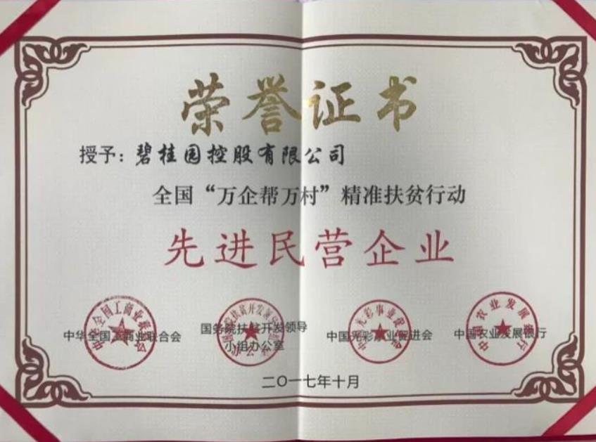 在第四個國家扶貧日到來之際,碧桂園被授予全國“萬企幫萬村”精準扶貧行動“先進民營企業”榮譽稱號。近年,碧桂園及楊國強父女已經榮膺中國消除貧困獎(創新獎)、首屆全國脫貧攻堅獎以及七項中華慈善獎等稱號,楊國強在2015年還以扶貧攻堅典范身份受到國家主席習近平會見。
