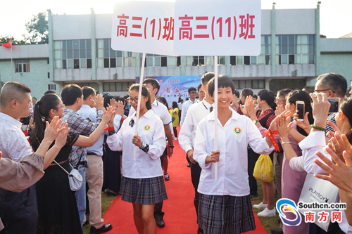 鮮花、拱門(mén)、紅地毯……16日,廣東實(shí)驗(yàn)中學(xué)附屬天河學(xué)校(下稱(chēng)“省實(shí)附中”)室內(nèi)體育館張燈結(jié)彩,省實(shí)附中2018屆高三學(xué)子在這里舉行成人禮。