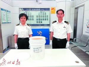 前日18時,一對夫妻從文錦渡海關入境大廳通關,兩人均背著大袋行李,同時女性旅客手上還提著一個大油漆桶過關,頗為吃力,現場關員見其神色匆忙且攜帶大量行李,遂對其進行重點檢查。當時油漆桶被白色蓋子蓋得很嚴實,蓋縫邊還有黑色膠帶纏繞,包裝很好,沒有任何氣味散發。當被問及油漆桶里裝的是什么時,男性旅客隨即稱是油漆,關員要求其打開蓋子驗證,打開后發現竟然是滿滿的橘紅色亮色液體,氣味撲鼻,查獲過多宗“止咳水”案件的關員當即初步判定這一大桶是“止咳水”,而此時作為老公的男性旅客立即改口稱桶里面裝的是油。