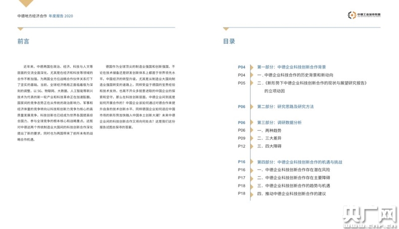 《新形勢下中德企業(yè)科技創(chuàng)新合作的現(xiàn)狀與展望》目錄(央廣網(wǎng)發(fā) 圖片來自《年度報告》)