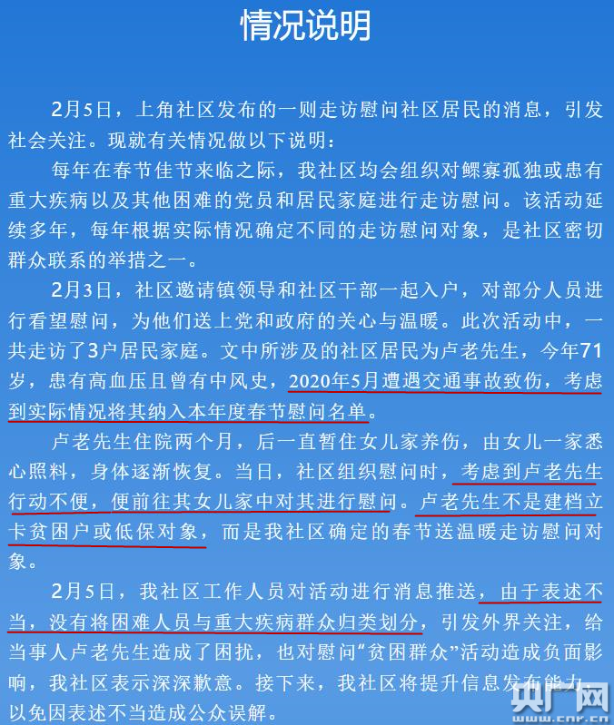 根據(jù)2月6日發(fā)布的情況說明,文中所涉及的社區(qū)居民盧老先生,今年71歲,患有高血壓且曾有中風(fēng)史,2020年5月遭遇交通事故致傷,不是建檔立卡貧困戶或低保對象,而是該社區(qū)確定的春節(jié)送溫暖走訪慰問對象。