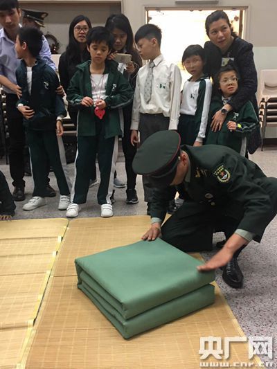 駐港部隊的戰(zhàn)士們向香港學生展示如何疊“豆腐塊兒”被子
