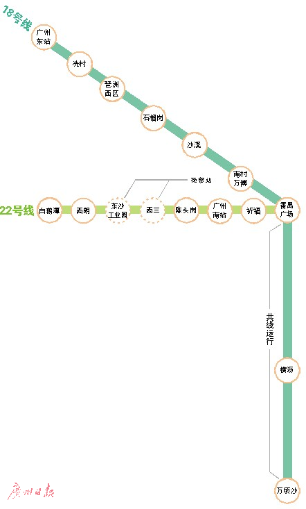 根據批復,22號線由番禺廣場至白鵝潭,連接廣州南站和白鵝潭樞紐,全長31公里。線路共設番禺廣場、白鵝潭6座車站。“為滿足沿線番禺、荔灣區發展和市民出行需求,預留西三和東沙工業園2座車站。”由于國家發改委批復的廣州新一輪地鐵建設規劃時沒有這兩站,因此,需要在下階段進一步深化論證,并完善相關手續。