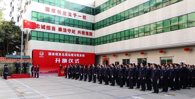 在青年護旗手的護送下,一面鮮艷的五星紅旗迎著朝陽在汕尾市稅務局辦公樓冉冉升起,在汕尾市稅務局黨委書記、局長龍成東的帶領下,200多名干部職工面向國旗肅立,稅容整潔,向五星紅旗行注目禮,共同祝福偉大祖國更加繁榮昌盛。