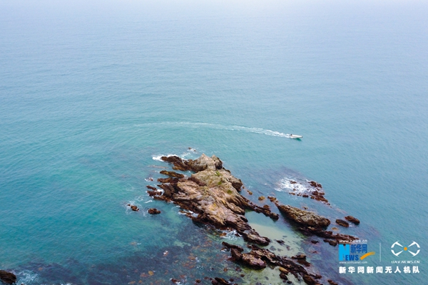 蔚藍的海,海浪拍打著礁石,船只穿過,好一幅美麗的畫卷。新華網(wǎng)發(fā)(陳楷攝)