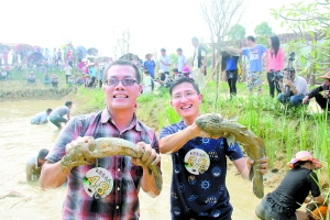 在昨天舉行的萬人抓魚大賽中,捕魚“勇士”與數十斤的大魚搏斗,驚險刺激。活動結束后,游客紛紛與自己抓到的大魚合影,最重的大魚超過40斤。