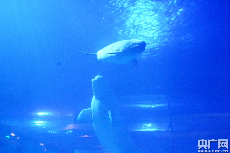 小白鯨“小五”與媽媽在玩耍。(央廣網發 主辦方供圖)