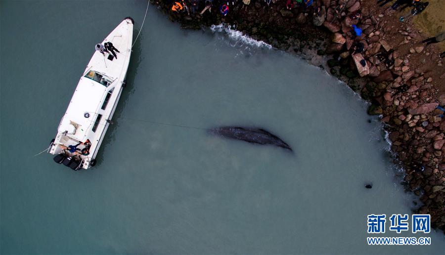 3月14日,在惠州港油庫碼頭附近海域,搭載著專家和漁政工作人員的船只停在抹香鯨旁。新華社記者 毛思倩 攝