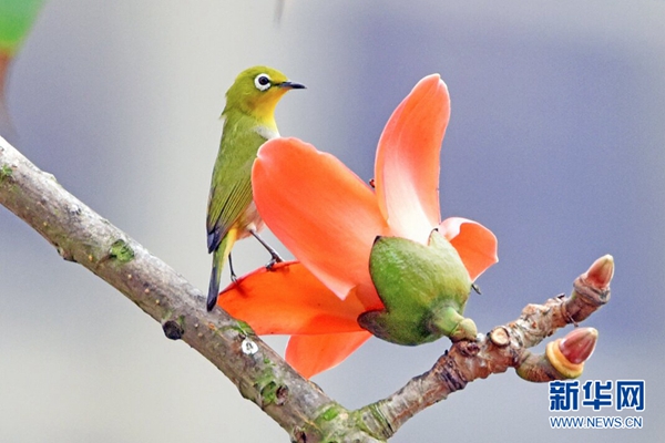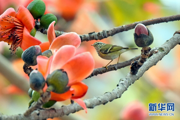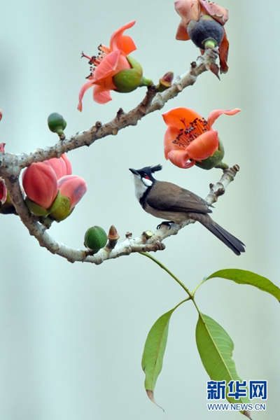 孔子文化城生態(tài)公園的木棉花盛開(kāi),吸引小鳥(niǎo)飛來(lái)享受“花蜜大餐”。新華網(wǎng)發(fā) (戴剛 攝)