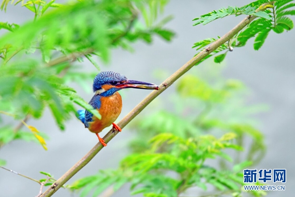 一只小鳥(niǎo)站在樹(shù)技上,長(zhǎng)長(zhǎng)的尖嘴叼著一條銀白的小魚(yú)。新華網(wǎng)發(fā) (戴剛 攝)
