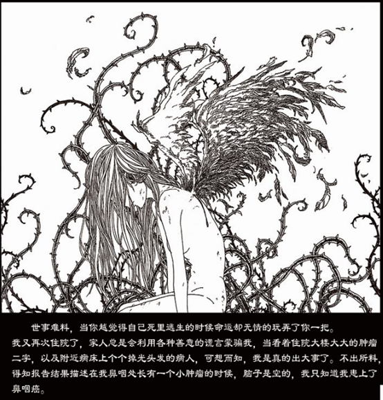 “奶白色的化療藥物濃郁得像牛奶一樣,刺眼的紅色圓點,貼在瓶子上,示意著這瓶藥性強烈的藥水正往我的血液里鉆,藥性可怕得能殺死我所有的細(xì)胞。艱苦的經(jīng)歷就此開始了,第一天的化療就十多瓶的藥水,一直打到了晚上。