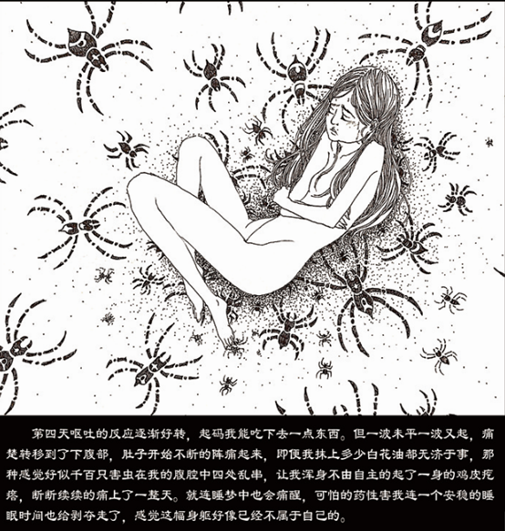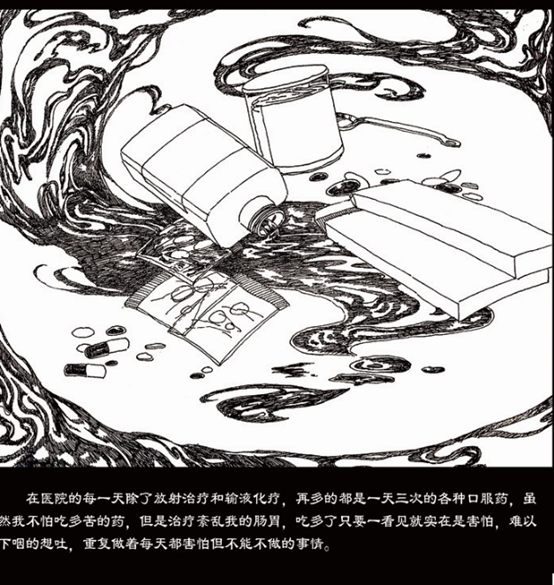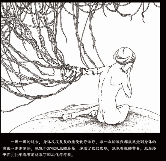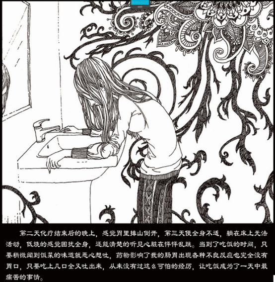 她畫的內(nèi)容是自己的治療過程。每次治療結(jié)束,身體狀況不錯的時候,她就會畫上一幅,從2015年10月一直畫到了2016年6月。而正是這些畫,讓她有了活下去的動力。“我當(dāng)時就想把我的故事記錄下來,希望我的抗癌日記完成之際,我的病也會好起來。”