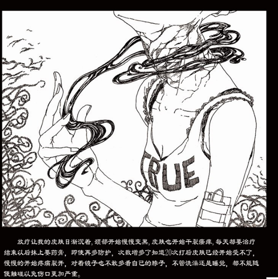 和放療的過程相比,隨后的副作用更考驗著人的承受力和意志力。低燒、嘔吐、失眠、口腔潰瘍一直困擾著她,就連皮膚也發(fā)生了變化。