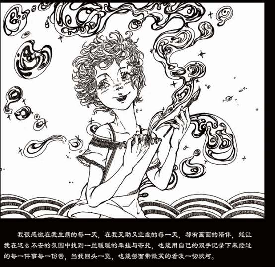 “生病以后才發(fā)現(xiàn),有個能讓自己開心的愛好是多么重要。”朱泳珊說,住院和治療的過程很漫長也很無聊,身邊的人不是在聊天就是看電視,她不想自己也這樣虛度時光,為了讓自己平靜下來,她拿起了筆開始作畫。