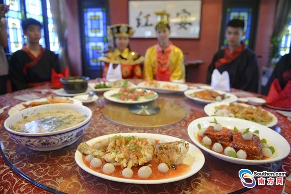 當然紅云宴為何重現傳統的場景也并不只有菜肴。上午9時30分,“六月六,紅云宴”開始,一群身穿南漢服裝的大臣和侍女等候在宴會廳外迎接貴賓。賓客入場后,施禮官介紹本次紅云宴活動,為活動正式開場。