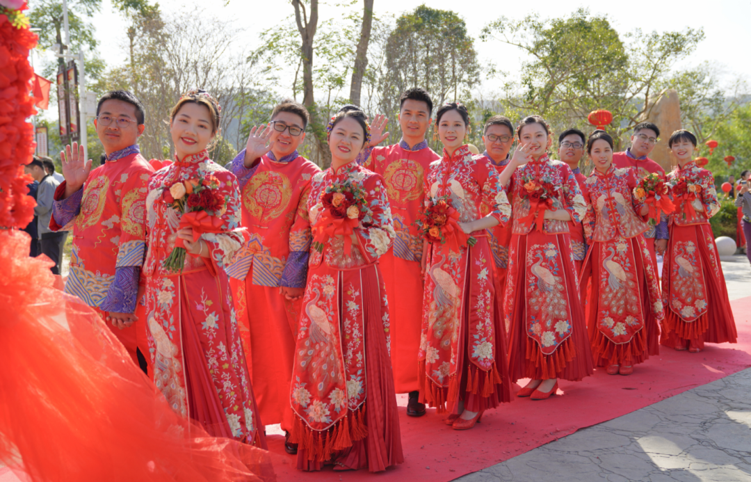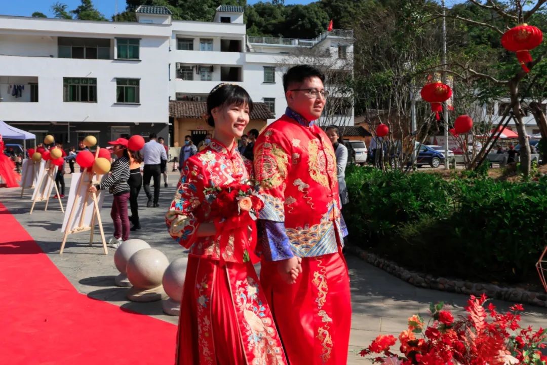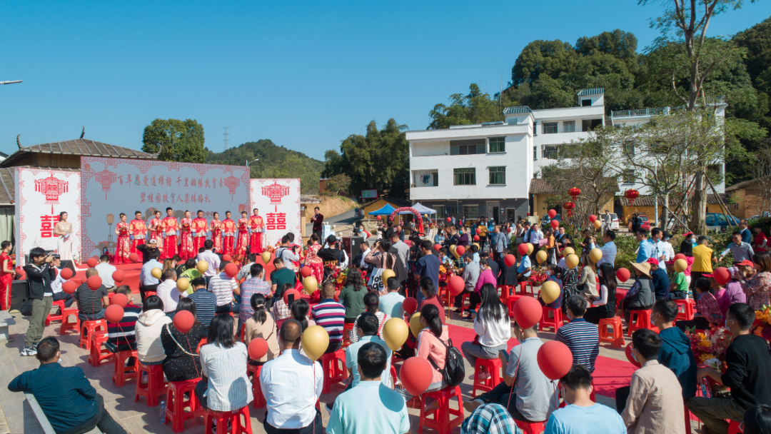 從魚咀開車一個多小時,就到了英德連江口鎮連樟村,6對新人在汀步觀景臺舉行了簡單的婚禮儀式。2018年習近平總書記在連樟村考察時說:“鄉親們一天不脫貧,我就一天放不下心來!爆F在的連樟村已經大變樣了——2019年底,全村54戶131名貧困人口已經全部達到脫貧退出標準;農家樂生意紅火,老板的拿手好菜麻竹筍炒肉片更是遠近聞名。儀式當天,國務院扶貧辦全國貧困村創業致富帶頭人(碧桂園連樟村)培訓基地揭牌暨首次開班儀式在連樟村鄉村振興學院舉行,學院將為貧困地區培養出更多的創業致富帶頭人。