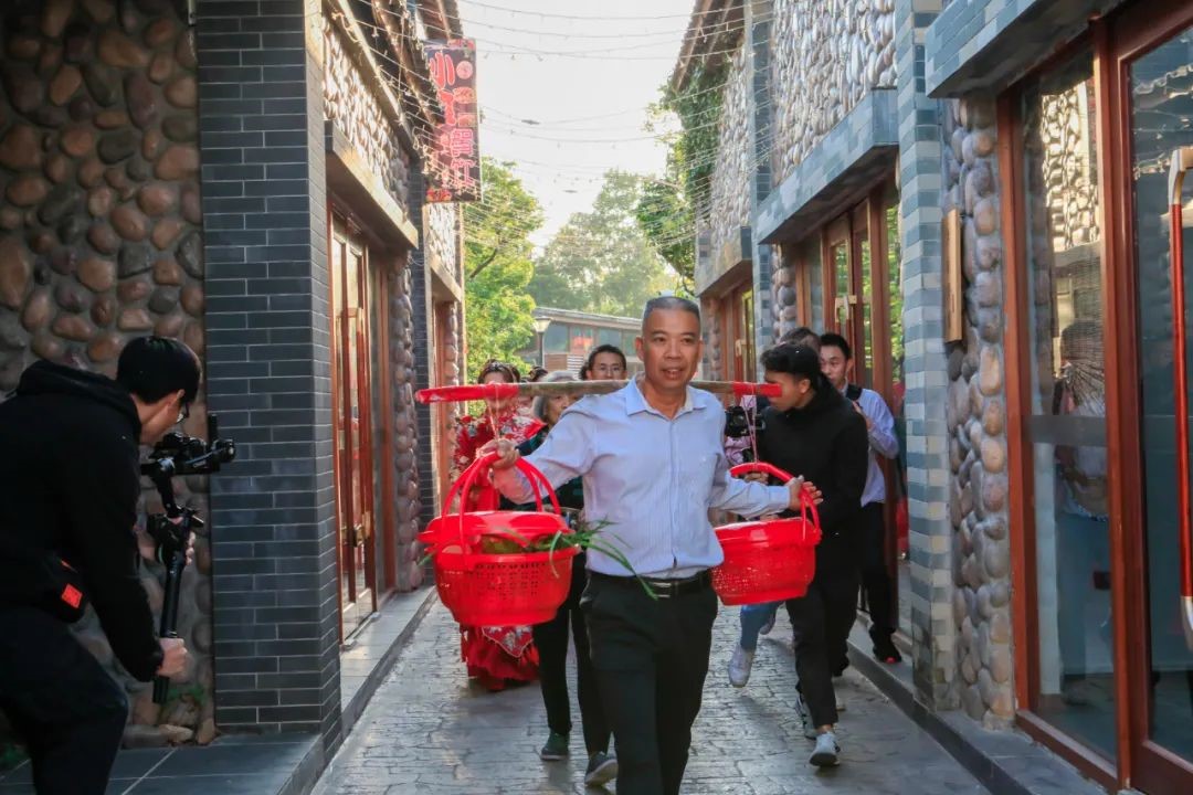 邱阿婆和林阿伯裝燒雞白酒的扁擔也準備好了。按照習俗,大家要挑選一個在村里德高望重的長輩,帶著新人前往玉虛宮祈福,邱阿婆想都沒想,脫口而出:“那阿其挑,讓阿其來挑。”很快,大家一致推舉出“老村長”廖志其來擔此重任,他接過扁擔,樂呵呵地領著迎親隊伍往前走。廖志其是這幾對扶貧人愛情的見證者,也是魚咀村的致富帶頭人——很多扶貧項目虧得有其叔在中間做思想工作,幫扶貧人員和村民牽線搭橋,項目才得以順利推進。