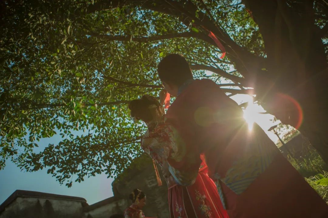 連江上的霧氣散了,微風和陽光在江面留下一層金色的粼粼波光,就跟新娘子秀禾服上的珠片似的。