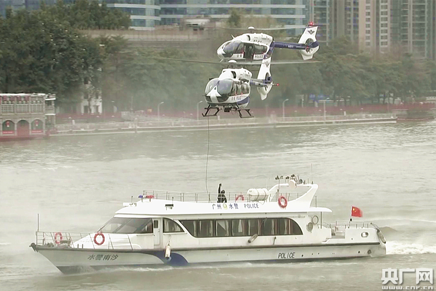 伴隨著人群的歡呼聲,兩架廣州公安警航支隊的警用直升機飛臨海心沙島南邊珠江水域,懸停在距江面約30米左右的高度。