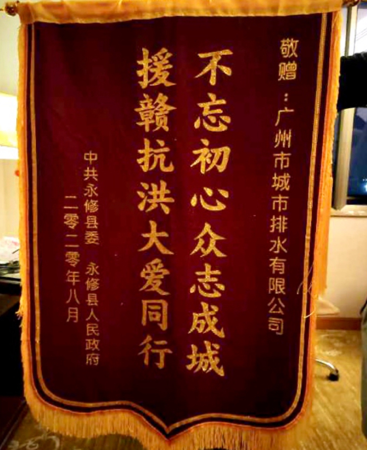 中共永修縣委、永修縣人民政府也給廣州水投集團廣州排水公司贈送了“不忘初心眾志成城 援贛抗洪大愛同行”的錦旗。