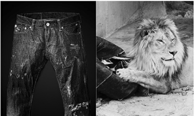 該組織請志愿者把牛仔布綁在輪胎等物品上,然后扔進(jìn)動物園的猛獸圈里,任由猛獸們撕咬、扯拽,由此形成各種洞洞牛仔布,然后交給制衣廠,做成四條牛仔褲。其中兩條是由獅子制作,另外兩條分別由老虎和熊“設(shè)計”。該組織表示,這些“洞洞”牛仔褲上的圖案都是由猛獸們“設(shè)計”的,而且保證每條褲子上的圖案各不相同,“全球唯一”。