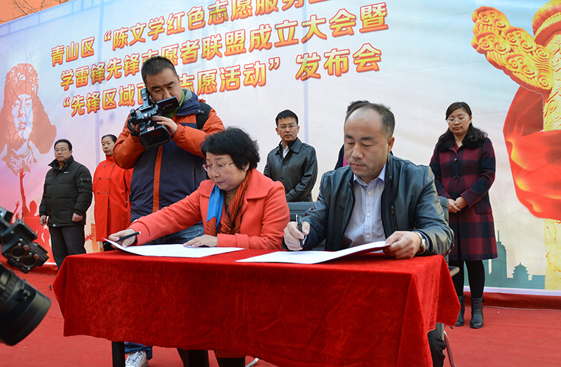 大地合唱團紅歌聯唱拉開了活動的序幕。云曉燕書記宣讀關于成立“陳文學紅色志愿服務工作室學雷鋒先鋒志愿聯盟”的決定。為更好依托陳文學工作室及轄區內的志愿服務團隊,先鋒道街道黨工委根據各社區實際情況制定全年志愿服務計劃特制定了“百次志愿服務活動”,活動現場志愿者代表簽名。同時,為繼承和弘揚志愿服務精神,先鋒道街道與各高校簽訂志愿服務實習協議,為有志愿服務理想的大學生提供展示的機會和平臺。會上,最美黨員陳文學作為志愿者代表宣讀倡議書,傳遞雷鋒精神,號召更多的人加入志愿服務的隊伍,幫助別人,奉獻自己。