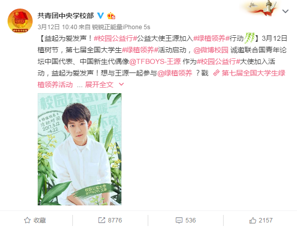 今年,王源、許魏洲、楊千嬅等眾多明星成為本屆活動的校園公益大使。明星大使通過短視頻號召大家加入到綠植領養活動,在校園中踐行公益,截止目前王源、楊千嬅、包貝爾、劉璇的四條短視頻播放量近1000萬次。在線上活動啟動當天,@TFBOYS-王源 3月12日發布自己擔任校園公益行公益大使的微博,該條微博互動量超過642萬,轉發量突破607萬。明星名人在公益推廣上發揮著巨大的作用,據微博數據顯示2016年微博明星名人發布的公益話題閱讀量超過300億次,本次校園公益行邀請王源、許魏洲等在學生群體中有眾多粉絲和巨大影響力的明星作為公益大使,充分調動了學生群體參與公益的積極性,讓大家自發參與到公益活動中。