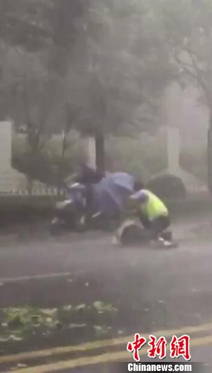 狂風暴雨中,民警為倒地男子擋住了風雨和過往車輛。 目擊者視頻截圖 攝