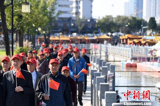 江蘇淮安百位老人攜手度重陽感受家鄉美,老人們紛紛用手機拍攝下日異月新的家鄉。10月24日,江蘇淮安清江浦區長東街道清淮路社區開展"攜老度重陽、金秋賞淮安"活動,組織了近百位老人一起游覽里運河風光帶,看城市建設變遷,感受家鄉的變化,開開心心迎接重陽節的到來。