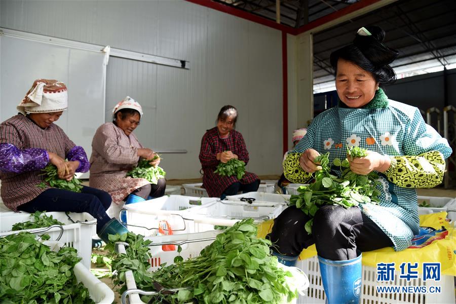 11月25日,在貴州省黔東南苗族侗族自治州榕江縣,當地婦女在三鑫天源生態農業公司整理蔬菜。