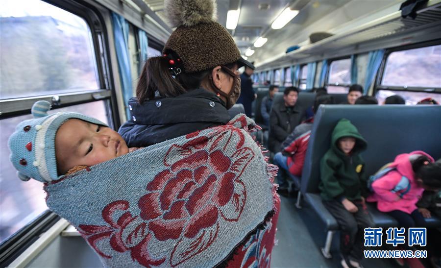 一名旅客背著孩子乘坐5633次列車出行(1月26日攝)。