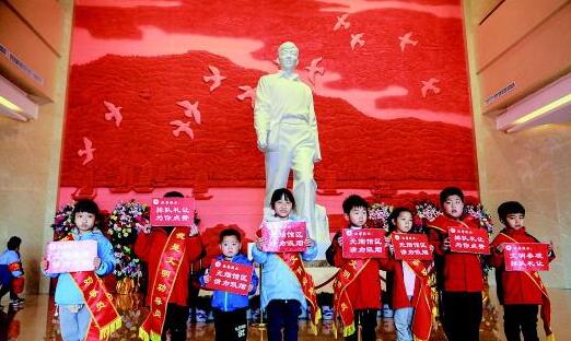 2018年寒假,“小小志愿者”在湖南雷鋒紀念館開展文明勸導活動,背景是以雷鋒在家鄉(xiāng)長沙望城當公職人員的形象為原型的塑像。(湖南雷鋒紀念館供圖)