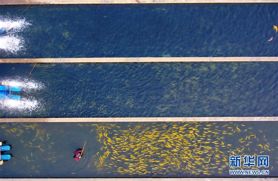 山西省平定縣娘子關鎮坡底村村民李海芳在養殖合作社內撈魚(2月27日無人機拍攝)。