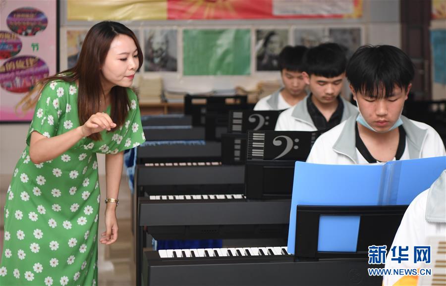 5月22日,瀘溪縣第五中學的老師(左)在給學生上鋼琴課。 瀘溪縣第五中學位于湖南省湘西土家族苗族自治州瀘溪縣武溪鎮,是一所農村普通完全中學。學校自2006年起免費開設各類藝術培訓課,培養農村學生的藝術興趣、專業特長。 新華社記者 薛宇舸 攝