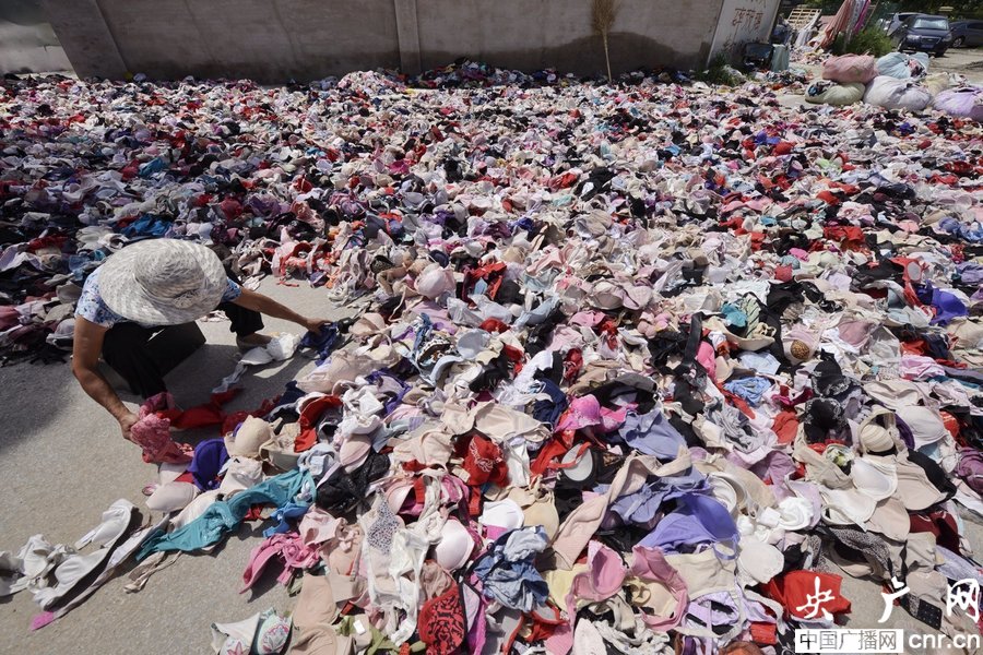 2014年8月6日,成壽寺地鐵站附近少角村,回收站工作人員在整理胸罩。近日,該回收站陸續回收了大量胸罩并當街晾曬,引起路人好奇。圖片作者:新京報王嘉寧/CFP