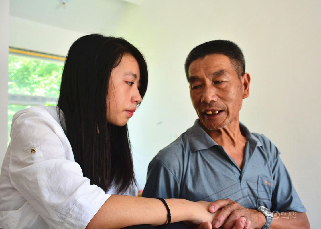 2016年8月2日,安徽省岳西縣毛尖山鄉(xiāng),今年剛剛高中畢業(yè)的劉園園,被合肥一所大學(xué)錄取。劉園園是一名棄嬰,18年前,被毛尖山鄉(xiāng)紅旗村五保戶(hù)的劉和帥收養(yǎng)。如今,父親年過(guò)花甲、體弱多病,已無(wú)力供圓圓讀書(shū)。她這個(gè)暑假要到當(dāng)?shù)氐囊患一疱伒甏蚬ぃ嵢W(xué)費(fèi)。圖為臨行前圓圓跟父親道別。吳均奇/東方IC