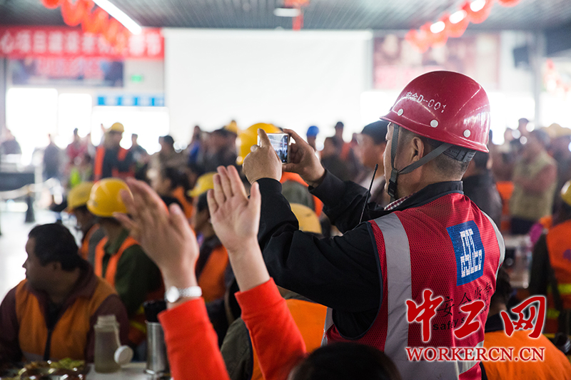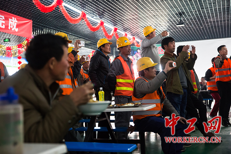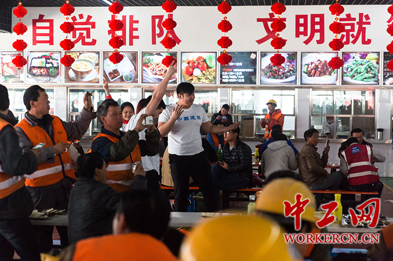 歌曲唱罷,一個人拿起喇叭喊話,“你干嘛呢?”另一個人拿著掃帚說,“我在學雷鋒呢”,話音剛落,從食堂的四面八方聚集一群演員,跳起了歡快的舞蹈,F場的農民工兄弟紛紛拿出手機,記錄下這驚喜的一幕!八麄儾恢缽哪睦锩俺鰜淼,太驚喜,太感動了,我已經錄下來了,回家給我家里人瞧瞧”。這是現場的一位農民工兄弟告訴主辦方的,F場,還有許多農民工兄弟們被熱烈的氣氛鼓舞,與演員們一起互動,一起跳舞,一起歌唱,非常開心!≈泄ぞW記者李雪峰 攝 -